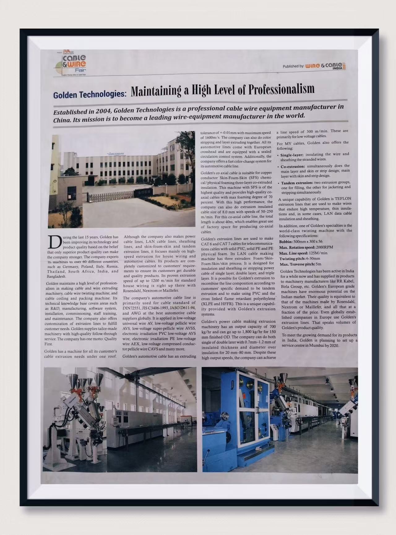 We are proud to announce that Golden Technologies has been recognized by our valued customer RR Cable and featured in Cable & Wire India. This acknowledgement highlights the trust and confidence RR Cable places in our equipment quality, technical capability, and long-term service commitment.